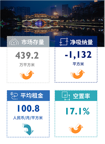 2022年第三季度,位于东大街商圈的ICC T2项目竣工交付进入成都甲级写字楼市场,总体甲级写字楼市场体量上升至439.2万平方米;本季度虽受高温限电、疫情等诸多因素影响,但部分商圈的大面积租赁成交促进全市甲级写字楼市场净吸纳量大幅增长,环比上季度提升约19,000平方米;新项目入市导致全市甲级写字楼市场空置率环比上涨;部分去化压力较大的业主为增加市场竞争力,以优惠价格增加谈判空间,使得全市甲级写字楼市场平均租金于本季度继续下调,录得100.8元每平方米每月;
