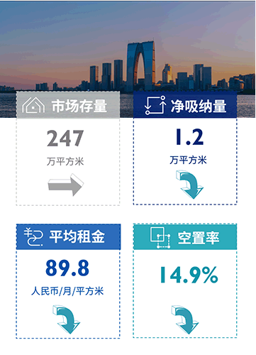 由于供应放缓,整体甲级写字楼市场以存量去化为主,空置率环比下降至24.3%;为提高吸引优质租户及提升市场竞争力,部分项目业主继续下调项目租金,导致全市甲级写字楼市场平均租金环比小幅下调;